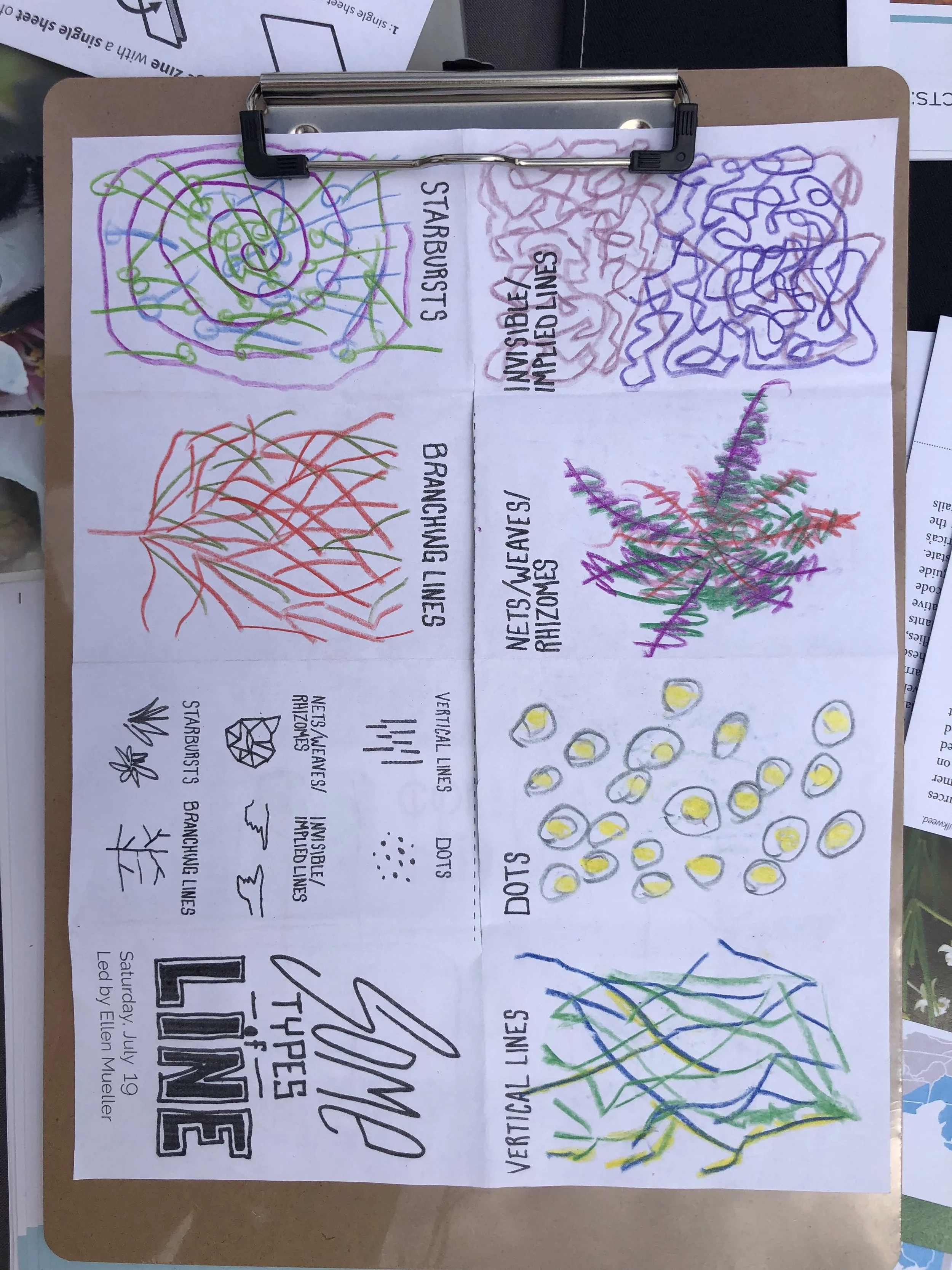 “A Line that Grows” is a conceptual line drawing using 28 nodding onions (Allium cernuum) as the drawing material. It is a living installation in Test Plot MN‘s garden that I will be returning to throughout the next 2-3 years to document the line’s growth. Will parts of the line die making it more of a dashed line? Will other parts become more blob-like? When and how will this temporary line eventually disappear as the greater garden evolves? I picked nodding onions because it’s a native plant to Minnesota, plus alliums are bunny-resistant due to their flavor and smell, and they thrive in full sun (planting for climate change). I held a line-drawing workshop featuring an interactive zine to help activate the site, and that is what is pictured here.