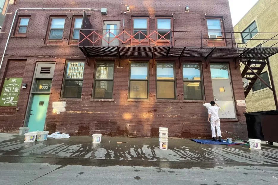 The mural is located in Roberts Alley, a very active pedestrian alley right behind Broadway in downtown Fargo. The wall's paint was chipped and brown, and I knew that a mural would create a richer, more interesting experience in the alley and also improve this section of wall. It supports the Downtown Neighborhood Association's goal of encouraging Fargoans and visitors to explore our downtown, appreciate public art's power, and enjoy family-friendly fun.