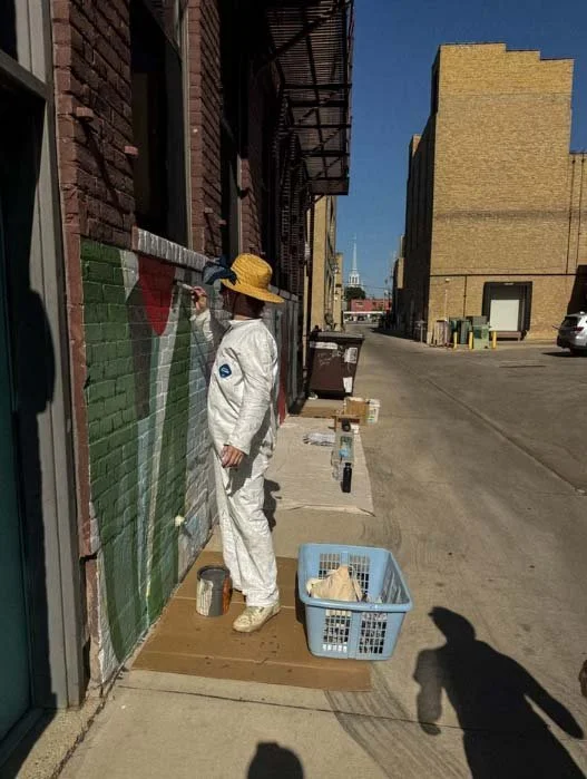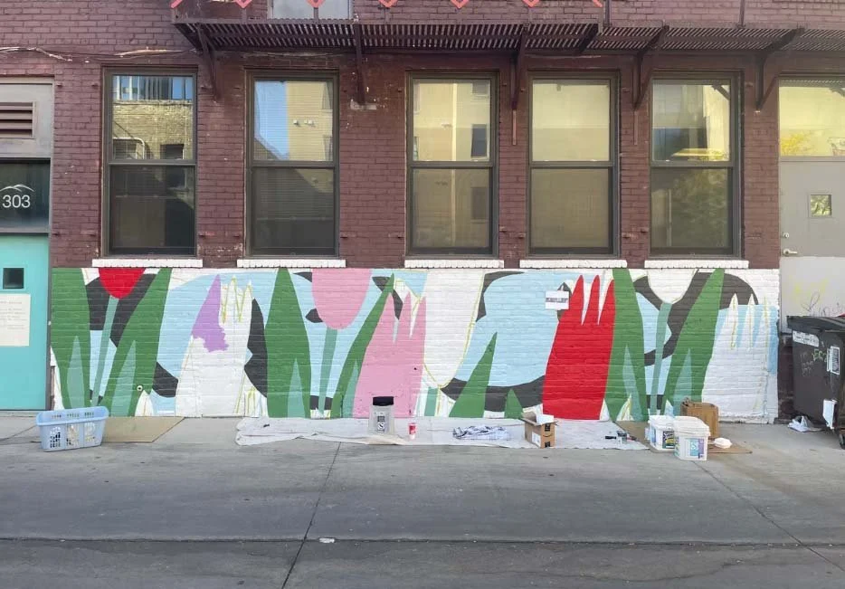 The mural features a close-up view of tulips in full bloom. The tulips are backgrounded by abstract representations of a river (blue) and stones (dark gray), set against a soil-colored background. In creating the design, I thought about the country gardens of my mother and grandmothers and the landscapes of the Red River Valley. I also wanted to build off of a past mural project which featured strawberry plants and a quilt-like structure. I hope that, for viewers, the mural brings to mind the wonder, beauty, power, and ever-changing state of the natural environment. This project is part of the Downtown Neighborhood Association’s four-part “Public Art Campaign," of which I am a member.